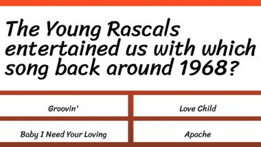 4/10 is the score to beat in this 1960s Songs quiz to put yourself over the average quiz taker. But you're probably going to be able to answer questions "Bobby Darin entertained us with which song back around 1960?" and "The Young Rascals entertained us with which song back around 1968?" easy!