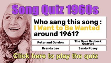 4/10 is what people on average are scoring in this 1960s songs quiz so far. Are you ready to answer questions like "Who sang this song : "Let's Twist Again" back in the 1960s?" and "Who sang this song : "I'm Henry the VIII, I Am" back in the 1960s?"