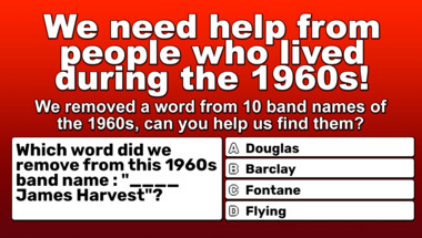 5/10 is the score to beat in this 1960s bands with a missing word quiz to put yourself over the average quiz taker. But you're probably going to be able to answer questions "Which word did we remove from this 1960s band name : "The ____ Dead"?" and "Which word did we remove from this 1960s band name : "Big Joe ____"?" easy!